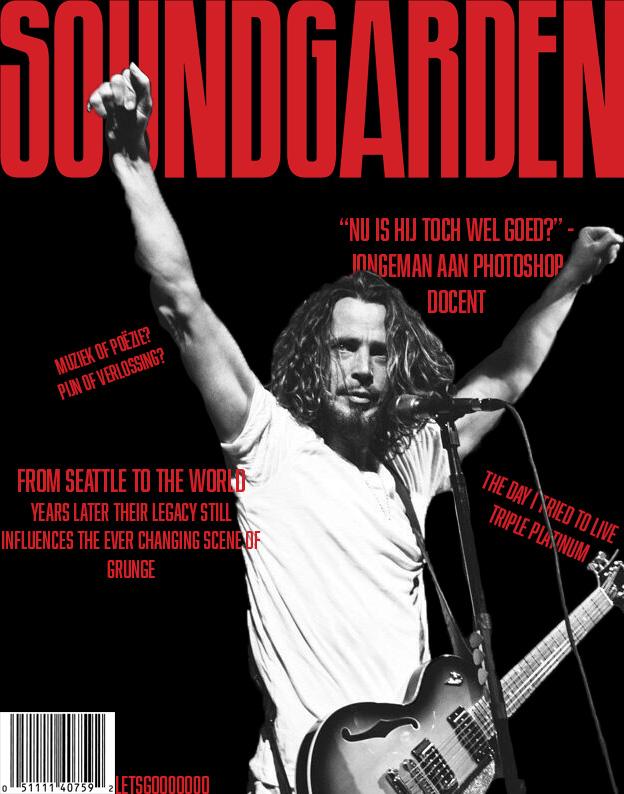 Voor photoshop kregen we de opdracht en magazine cover te maken voor een band of artiest, hierbij heb ik deze cover gemaakt voor de uit een gebroken grunge band ‘soundgarden’.